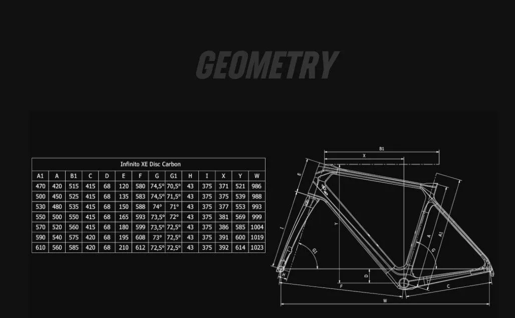 - Frame: Infinito XE Disc carbon, tapered HT 1,1/8″- 1,5″, Mechanisch/Elektronisch/Elektronisch Di2 schakelbaar, compatibel met 32″ band, PressFit 86,5x41mm BBset, steekas 12x142mm, maten 47-50-53-55-57-57-59-61cm.