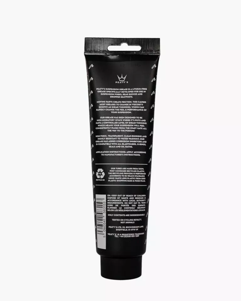 Peaty’s Suspension Grease is lithiumvrij vet dat speciaal is ontwikkeld voor gebruik in verende vorken, achterschokdempers en zadelpen droppers
